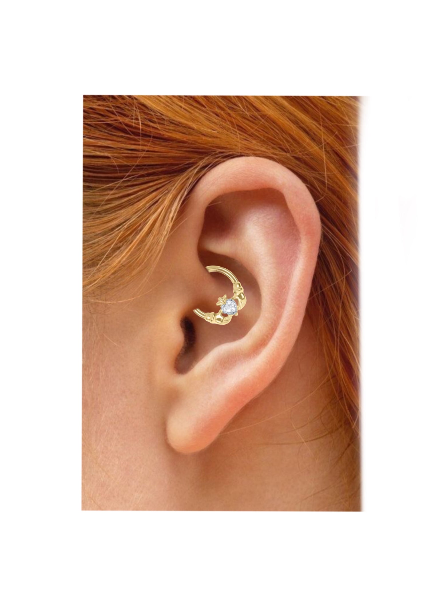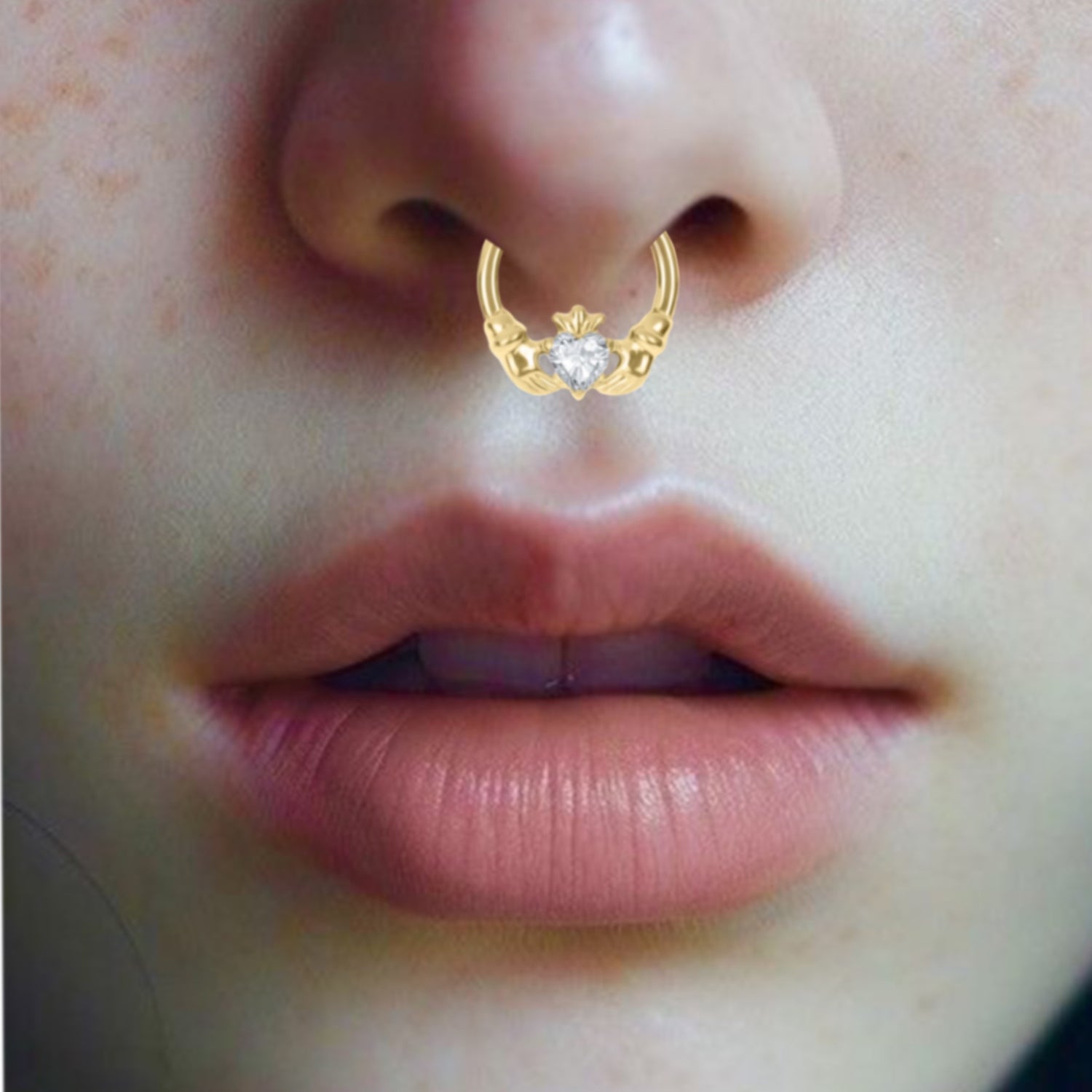 Inspired by the traditional Irish Claddagh, this hinged clicker ring features the iconic symbols of love (the heart), loyalty (the crown), and friendship (the hands) reimagined in a sleek, wearable clicker style.